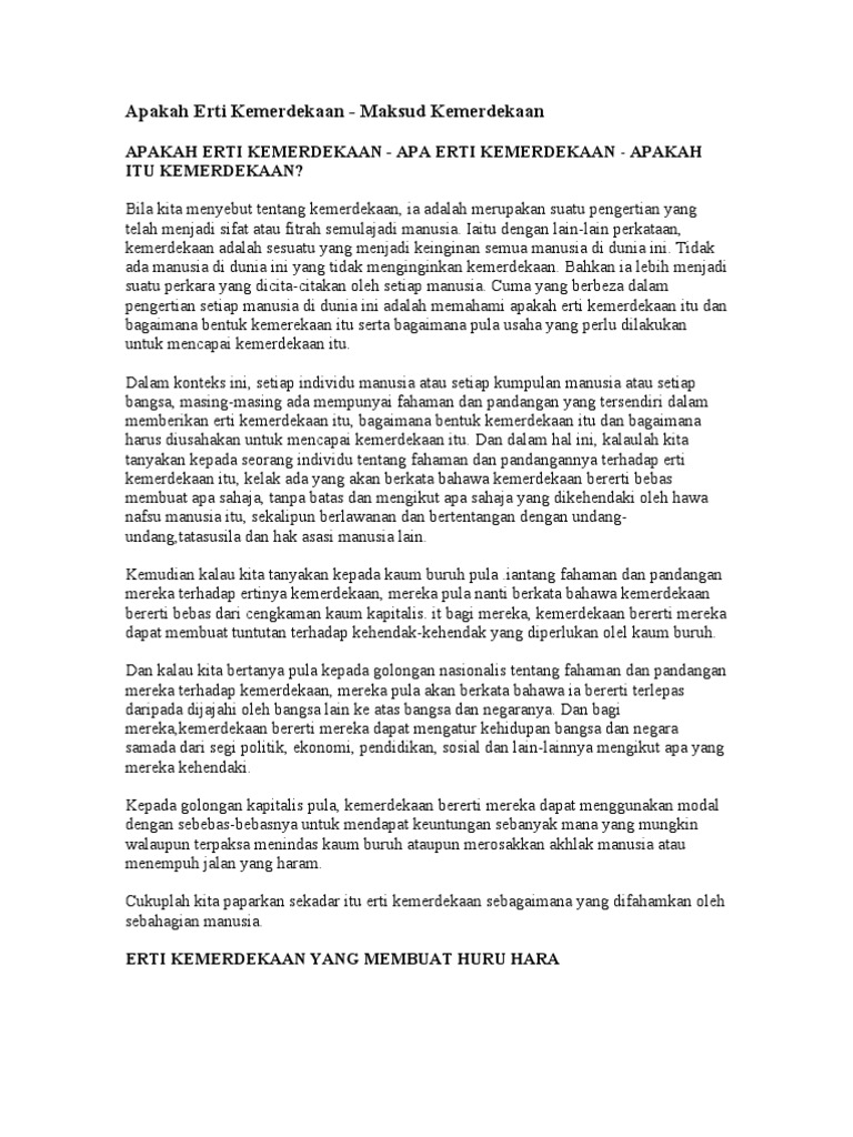 Maksud Kemerdekaan from image.slidesharecdn.com Menurut kamu kemerdekaan yang sesungguhnya seperti apa? 1 apakah maksud sejarah menurut kamus dewan? Fakta jelas menunjukkan bahawa barat telah menjajah dengan menguasai tanah, khazanah, fikrah, akidah dan siasah agar semuanya tunduk dan dibolot oleh mereka. Kerencaman dalam bahasa inggeris ialah: Perjuangan untuk memperolah kemerdekaan indonesia tidaklah muncul begitu saja. Kemerdekaan tersebut bukan hanya dalam konteks negara semata tetapi juga individu dan masyarakat yang menjadi pengisi sebuah negara. Maksud dan tujuan didirikan muhammadiyah itu merupakan redaksi terkini, dalam sejarahnya pernah mengalami beberapa kali perubahan sejak awal berdiri sampai diputuskan dengan redaksi terbaru. Sedangkan dalam konteks masyarakat, kemerdekaan adalah ketika mereka tidak lagi menjadi pengekor pola pikir, budaya dan bahkan.